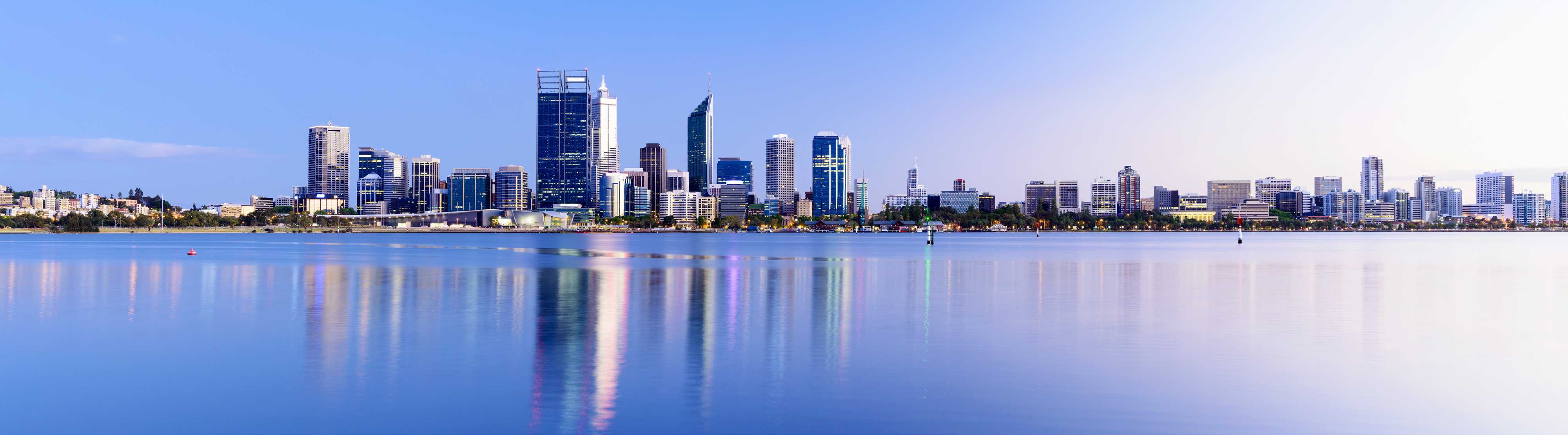 The Perth city skyline at twilight, viewed across the Swan River, Western Australia.